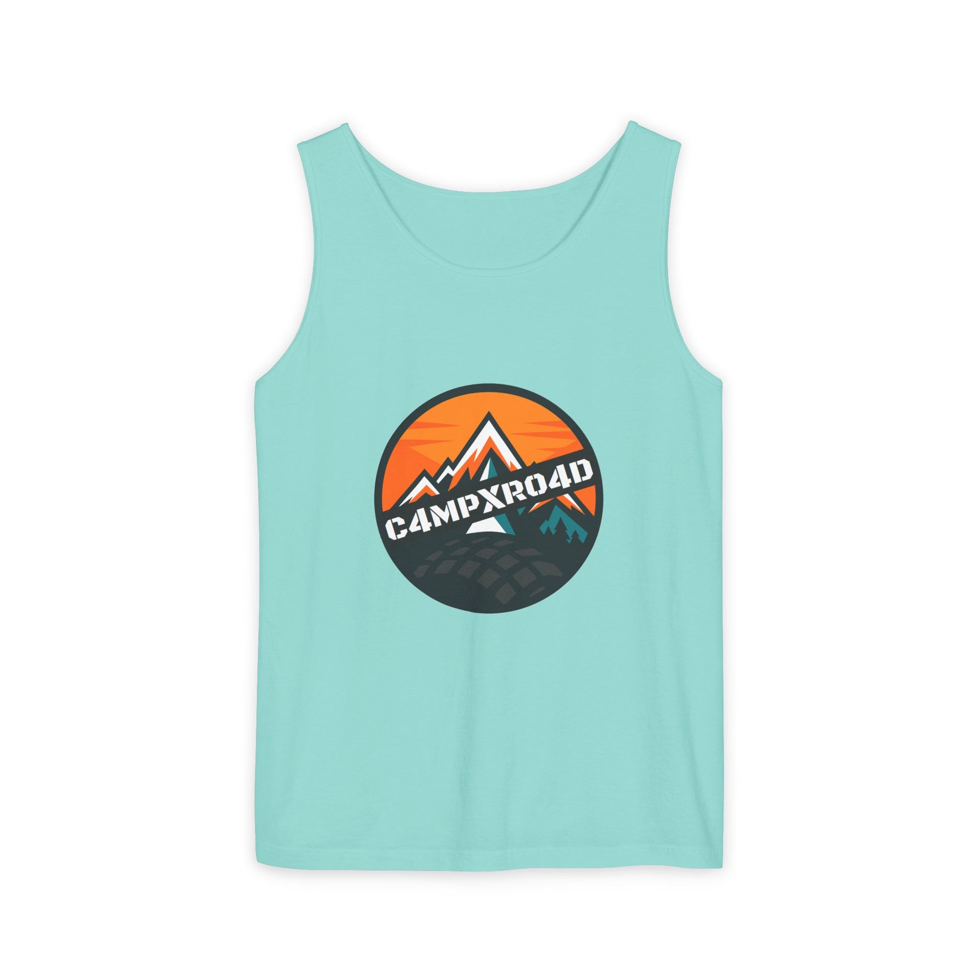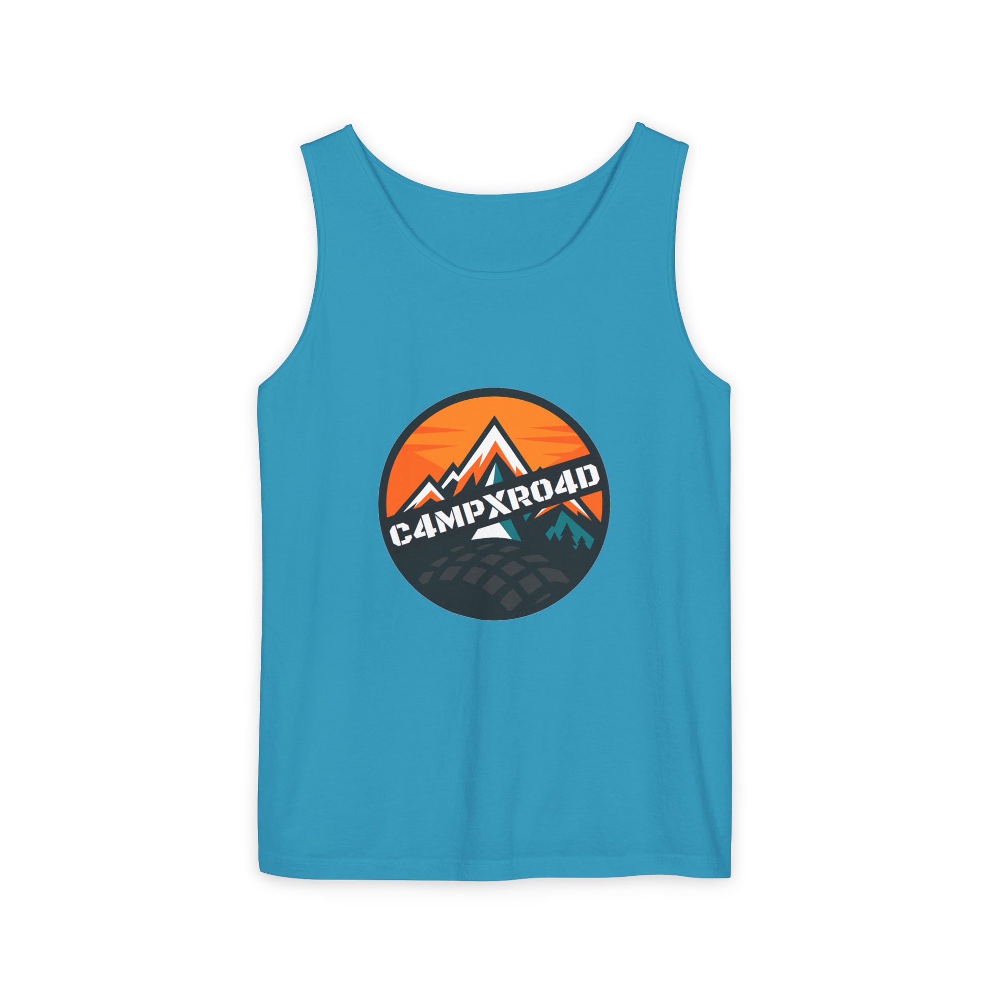 C4MPXRO4D Rounded Shield Camper Badge Tank Top | Graphic camping text tee