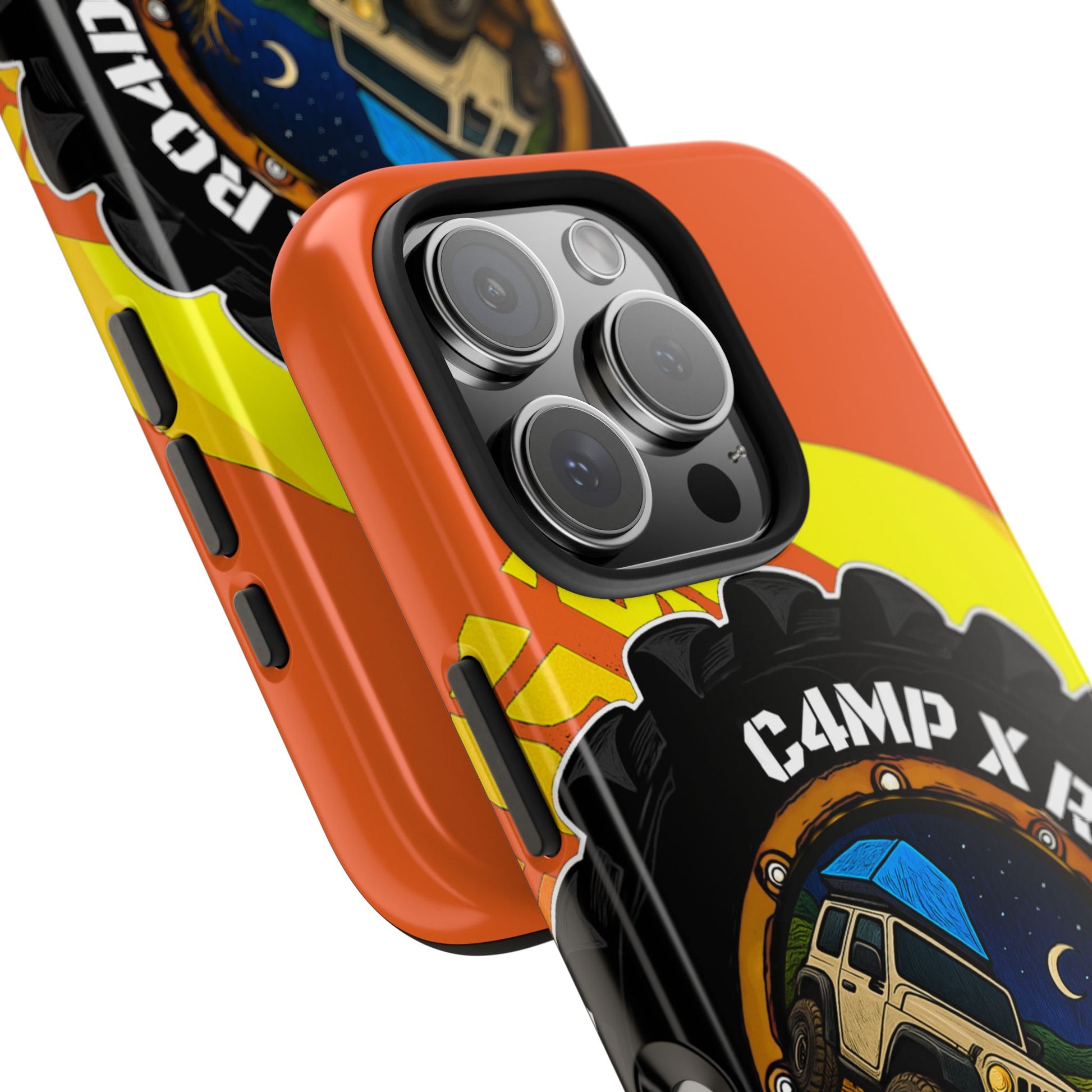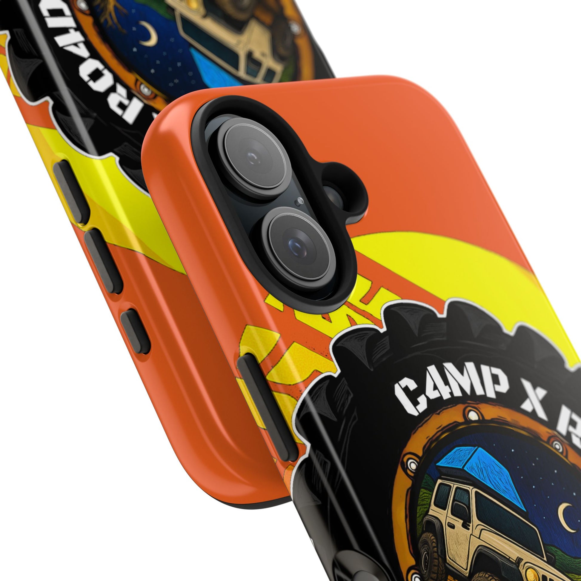 Rugged, travel-ready phone protection with a bold outdoor vibe. This hard-shell case combines a glossy, full-color print with a two-piece impact design — a tough polycarbonate outer shell and a shock-absorbing TPU liner — so your device looks sharp while standing up to bumps and drops. The lay-flat bezel helps keep the screen off surfaces, and UV-resistant inks keep the illustrated off-road and campsite artwork vivid through sun and weather. Slim enough for everyday carry and compatible with wireless charging, it blends practical protection with a design that speaks to campers and overlanders who live for dirt roads, late-night campfires, and star-filled skies.